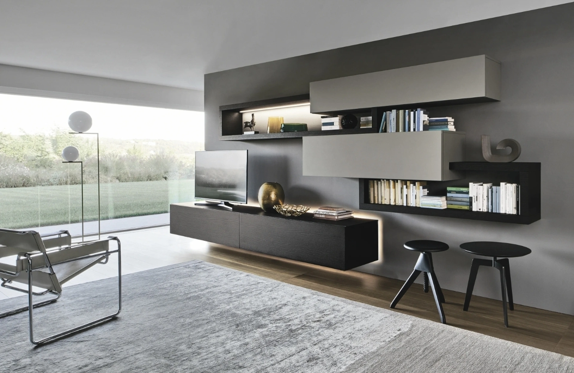 Vuoi ammobiliare un living pratico e operativo? Ecco a te la parete attrezzata Lampo 046 Sangiacomo dalle forme decise moderne.